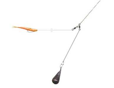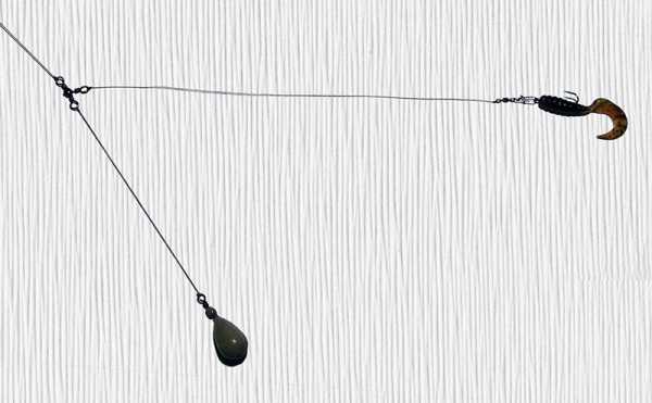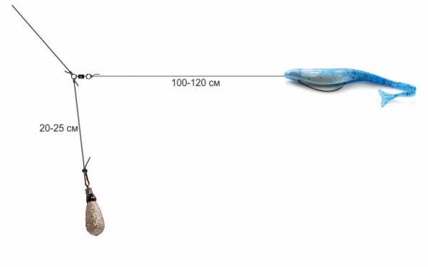 Базовый принцип оснастки под названием “отводной поводок”, достаточно прост. На конце лески привязано грузило, а выше, на некотором расстоянии крепится поводок, на котором, в свою очередь, уже привязывается крючок с силиконовой приманкой.