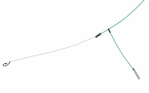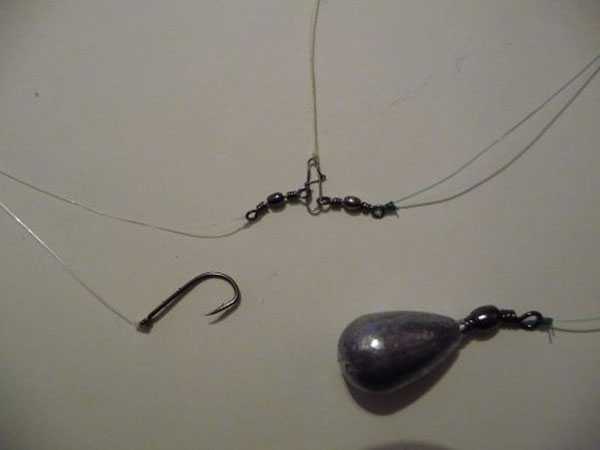 Имеется поводок из относительно толстого флюорокарбона. На одном конце крепится грузило оснастки, на другом – вяжется вертлюжок. Этот вертлюжок надевается на основной шнур снасти, он свободно скользит. На конце шнура привязывается еще один вертлюжок. Если используется тяжелый груз, будет не лишним поставить небольшую бусинку на шнуре, между вертлюжками, чтобы те не бились друг о друга, не попортили узел. На свободное колечко второго вертлюжка крепится наш отводной поводок из тонкого флюорокарбона, на конце которого будет приманка.