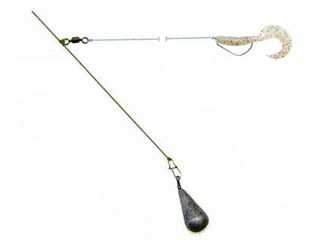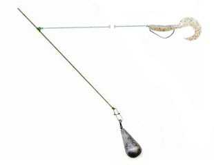 В монтаж входит грузило в 15-30 грамм (в зависимости от наличия течения и глубины предполагаемой ловли) и джиг-приманка длиной в 5-7 см (твистер или виброхвост) с крючком (!не джиг-головкой).Оснастка выглядит следующим образом: