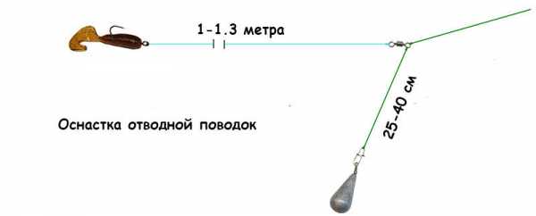 Отводной поводок представляет из себя оснастку из основной лески, на конце которого расположено грузило, а также из поводка с приманкой (блесной, джиг-приманкой, воблером). Главным преимуществом оснастки “отводной поводок” является его чувствительность, а также зона проводки приманки (вблизи дна).