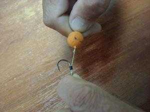 Жало крючка обязательно выводится наружу и остаётся открытым. Пусть это вас не смущает, на количество поклёвок карпа это не повлияет, но зато при поклёвке рыба точно зацепится за крючок. Если же вы будете прятать жало крючка внутрь горошины, то будет случаться очень много холостых поклёвок.