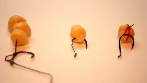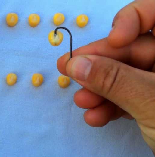 Насаживать горошину на крючок нужно по глазку — это сравнительно светлое пятно, в которое и нужно вгонять жало. И помните о том, кого собираетесь ловить. Если рассчитываете поймать осторожную рыбу, лучше спрятать кончик крючка в горошине, а вот вывести его можно тогда, когда вы охотитесь на жадного хищника.
