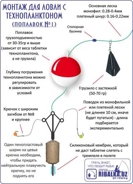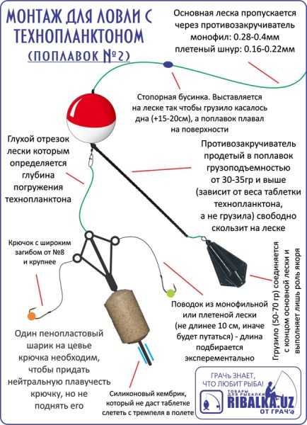 Как видно из рисунка, крючок с насадкой из шарика пенопласта будет все время находиться в облачке приманки, в то время как сама таблетка технопланктона будет расположена достаточно близко ко дну, но все же не лежать на нем. Аналогичен представленному и монтаж с использованием кормушки-макушатника.
