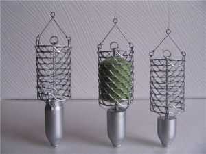 Палочка толстолобика может быть выполнена в виде сетчатой кормушки, в которую помещается технопланктон. Поводки крепятся или к петелькам, имеющимся в проволочной конструкции, или к основной леске.
