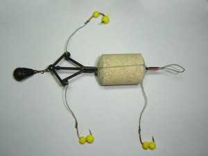 К противоположному углу крепится основная леска. Поводки с крючками привязываются к двум оставшимся углам рамки. На крючки цепляются шарики пенопласта, которые приподнимаются над поверхностью дна и облегчают рыбе задачу по заглатыванию корма.