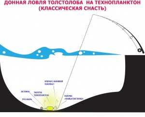 Ещё один вариант донной оснастки (для пикерной ловли)Техника ловли толстолобика на технопланктон достаточно проста. Готовая оснастка забрасывается в точку ловли, удилище устанавливается на подставку. Поклевка контролируется по поплавку (в случае поплавочной удочки), кончику удилища, колокольчику или электронному сигнализатору (в случае донной снасти).