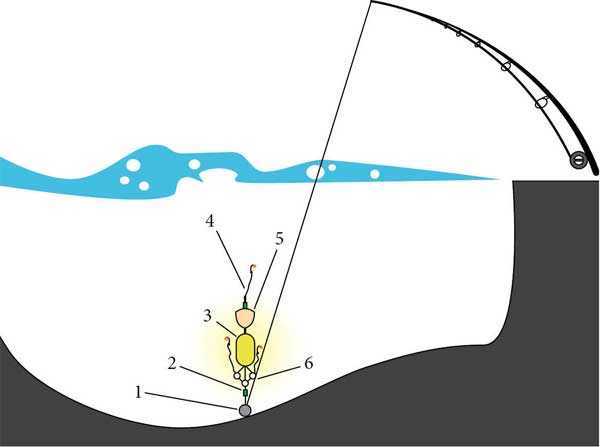 Рис. 60. Монтаж, не дающий возможности натянутой леске быть препятствием для рыбы: 1 – груз-якорь; 2 – застежка; 3 – таблетка технопланктона; 4 – крючок; 5 – поплавок; 6 – палочка «убийца толстолобика»