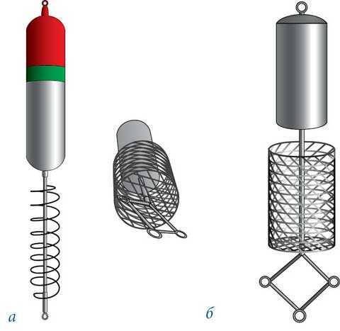 Рис. 61. Кормушки для донных монтажей: а – кормушка-пружина с поплавком; б – универсальная цилиндрическая кормушка