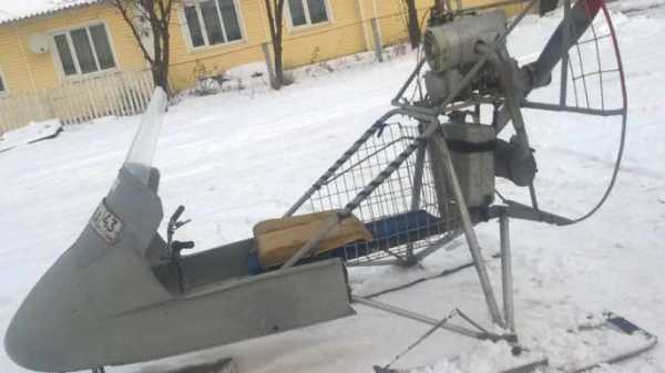 Подобная конструкция намного проще, чем вышеописанная конструкция. В качестве двигателя здесь используется мотор от бензопилы. Несмотря на свою простоту, на подобных аэросанях вряд — ли кто-нибудь решится поехать на рыбалку.