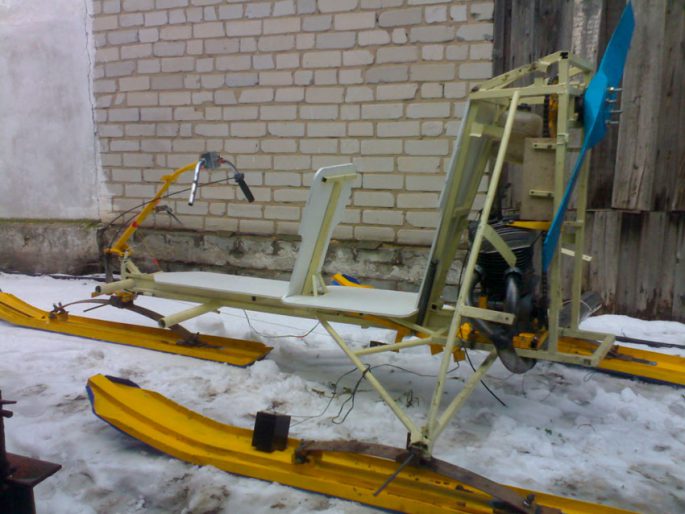 На сани можно установить мотор от мотоцикла «Юпитер», хорошим вариантом станет двигатель, снятый с «Жигулей». Можно использовать К-62И. Это карбюратор, который имеет 2 цилиндра. Зажигание осуществляется от батареи, а топливный бак рассчитан на 30 л бензина.