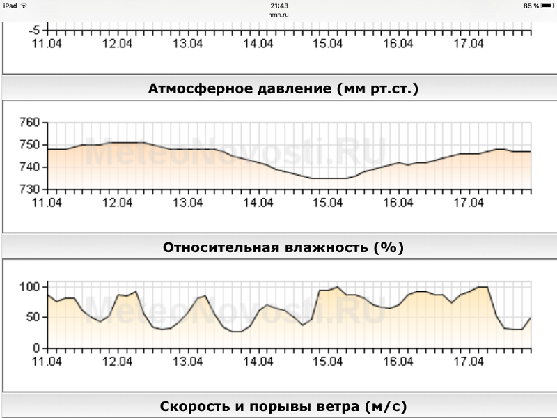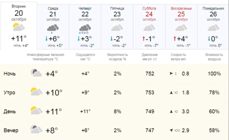 | Вечер | Вечер−4° | пасмурнобез осадков | 742 | 97% | ЮЮВ, 3м/с |