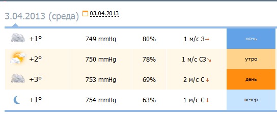 | Утро | Утро−3° | пасмурнонебольшой снег | 742 | 96% | ЮЮВ, 4м/с, порывы 10 | |