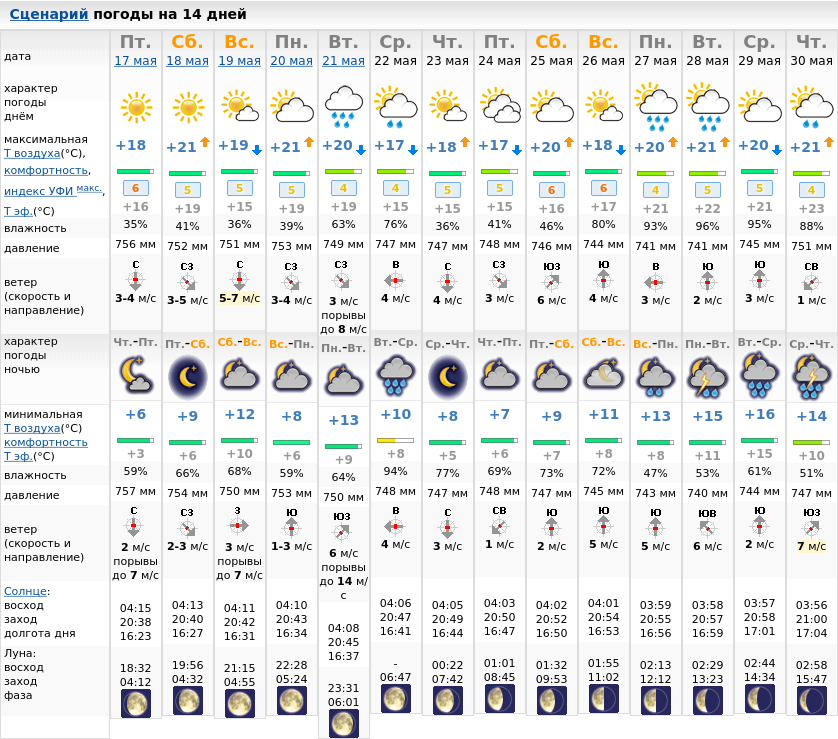 | 17:00−2. | Облачно | 0 | 4 м/с, ЮЗ | 742 | 89% | ||
