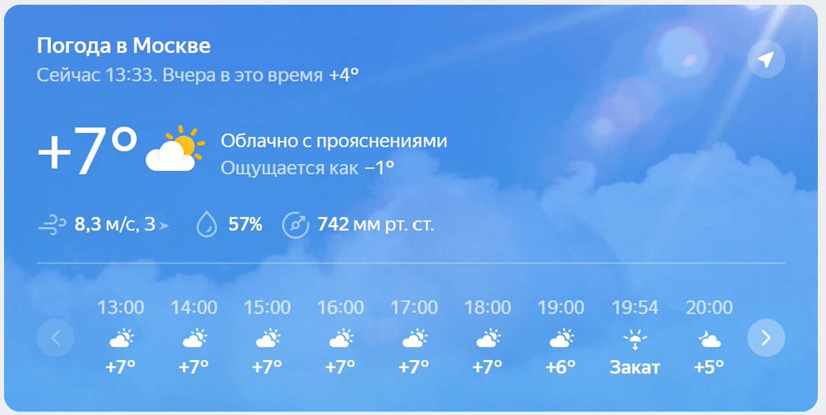 | 19:00−3.4° | Облачно | 0 | 4 м/с, ЮЗ | 742 | 90% | ||