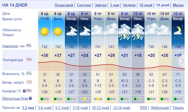 Дневная и ночная температура в Кондратове Интерактивный график температуры воздуха в Кондратове за период 08 — 14 февраля.Минимальное значение дневной температуры ожидается на отметке +23°F, максимальное ожидается на отметке +30°F. Погода в Кондратово на картеПогода в крупных и близлежащих городахВологда, Россия — март Прогноз погоды и климатическая информацияМарт, первый месяц весны, в Вологде также является минусовым холодным месяцем с температурой в пределах среднего максимума -1.8°C (28,8°F) и средний минимум -7,5°C (18,5°F).ТемператураВ Вологде средняя высокая температура в марте незначительно повышается от -5,3°C (22,5°F) в феврале до все еще морозного -1,8°C (28,8°F). Средняя низкая температура в марте составляет -7,5 ° C (18,5 ° F).ВлажностьВ марте средняя относительная влажность составляет 94%.ОсадкиВ Вологде в марте идут дожди в течение 5,3 дней, обычно выпадает 19 мм (0,75 дюйма) осадков. В течение года их 113.9 дождливых дней, выпадает 308 мм (12,13″) осадков.СнегопадЯнварь-май, сентябрь-декабрь — месяцы снегопада. Март — месяц с наибольшим количеством снегопадов. Снег выпадает в течение 21,3 дней и накапливает 114 мм (4,49″) ) снега.Световой деньВ Вологде средняя продолжительность светового дня 11,9ч.Солнечный светСреднее количество солнечных часов в марте составляет 2,1 часа.УФ-индексМесяцы с самым низким УФ-индексом в Вологде — с января по март, с октября по декабрь, со средним максимальным УФ-индексом 1.Показатель УФ-индекса 2 и ниже представляет собой низкую угрозу для здоровья от воздействия солнечных УФ-лучей для среднего человека.Примечание : Максимальный дневной УФ-индекс 1 интерпретируется как следующая рекомендация: Для большинства длительное пребывание на солнце не вызывает большого беспокойства. Младенцы и люди с чувствительной кожей всегда должны быть защищены. Солнечная радиация наиболее сильна ближе к полудню, поэтому воздействие прямого солнца должно быть соответственно уменьшено. Солнцезащитная одежда, рубашка с длинными рукавами и брюки, шляпа с широкими полями и солнцезащитные очки, блокирующие УФ-А и УФ-В, особенно помогают блокировать вредное воздействие УФ-излучения. Осторожность! Отражение снега может почти удвоить интенсивность солнечного УФ-излучения.Рекордная жара в России продлится до июля – Служба погодыРекордная жара, обрушившаяся на Москву и другие регионы России, не собирается спадать до июля, сообщил в среду газете «Известия» глава Гидрометслужбы. Если вначале метеорологи предсказывали отступление аномальной жары в начале следующей недели, то теперь аномальная температура продлится до июля, сообщил «Известиям» глава Росгидромета Роман Вильфанд. Этот вторник стал самым жарким 22 июня в Москве с 1879 года, сразу после того, как понедельник стал самым жарким 21 июня с 1956 года. Но абсолютный рекорд для любого дня июня был установлен 23 июня, когда температура достигла 34,8 – на 0,1 градуса жарче предыдущего Июньская запись 1901 года. И как и ожидалось, четверг 24 июня стал самым жарким в истории Москвы, столбики термометров достигли 33,8 С. На этой неделе аномальную жару ощутили и другие города России. Волны тепла обычно вызываются длительными антициклонами, которые возникают, когда атмосферное давление удерживает горячий воздух ближе к земле, уменьшая облачный покров выше. Условия антициклона над Россией сейчас напоминают те, что 