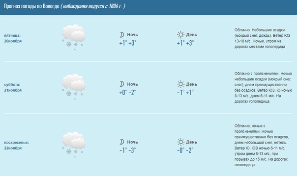 Сегодня в Вологде ожидается около 0°, пасмурно, утром небольшой снег. Ночью −4°..−6°. Ветер южный 5 м/с. Давление 742 мм рт.ст. Завтра −2°..−4°, пасмурно, вечером небольшой снег. Ветер юго-западный 3 м/с. Давление 743 мм рт.ст.