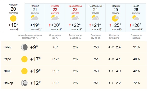 19:00−1. 6° | Облачно | 0 | 3 м/с, ЮВ | 742 | 91% | ||