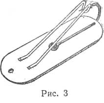 В заключение предлагаю спиннингистам простейшую конструкцию незадевающего тройника, пригодного для оснащения колеблющихся и вращаю-щихся блесен. На тройник надевается пластинка, вырезанная из тонкой рентгеновской пленки (рис. 6).