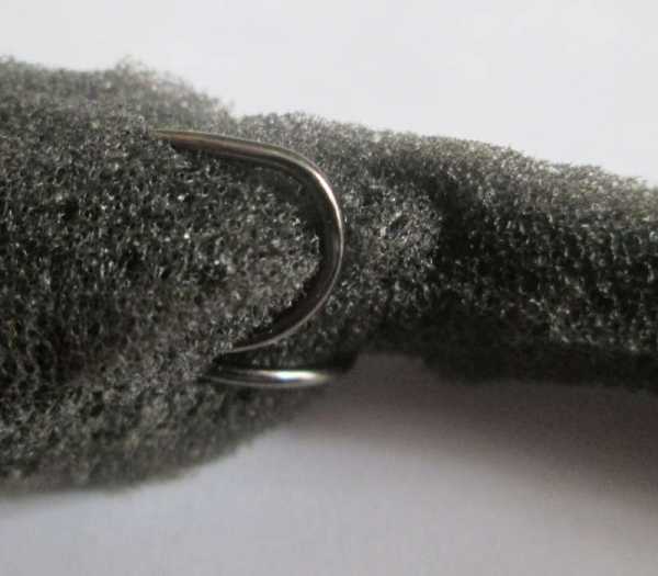 - Аналогичная задача стоит перед рыболовом при изготовлении поролоновой рыбки. После вырезания тела необходимо внедрить двойничок в приманку. Для этого лезвием делается разрез в нижней части приманки, начиная с головы, на длину цевья крючка. Двойник вставляется таким образом, чтобы оба жала расположились параллельно спинке и острием смотрели в сторону головки. После этого при помощи клея соединяются разрезанные части поролона. Острия крючка можно плотно подогнуть к телу.