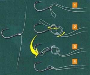 Крючок привязывается узлом под названием “паломар”. Для этого сначала делают двойную петлю. Потом леску продевают в ушко крючка. Теперь петельку завязывают в простой одинарный узел. Его не нужно затягивать до конца. Следует закинуть петлю сверху на крючок. Теперь узел можно смочить и затянуть.
