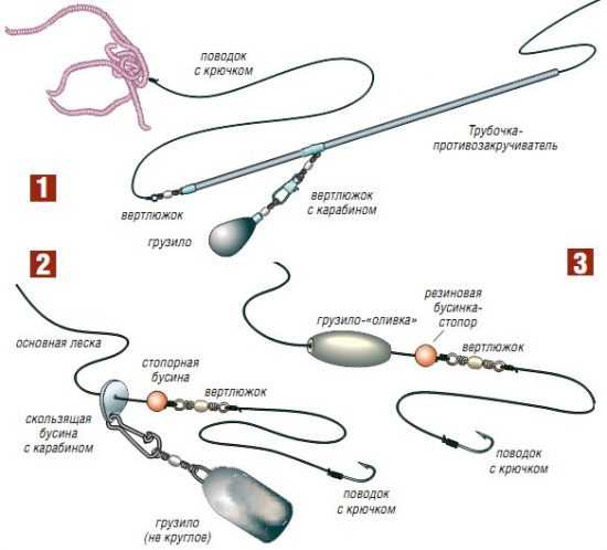 Варианты монтажа оснасткиТаким образом при зацепе, которые не редки при ловле донной снастью оборвется только груз, остальную же оснастку менять не придется.