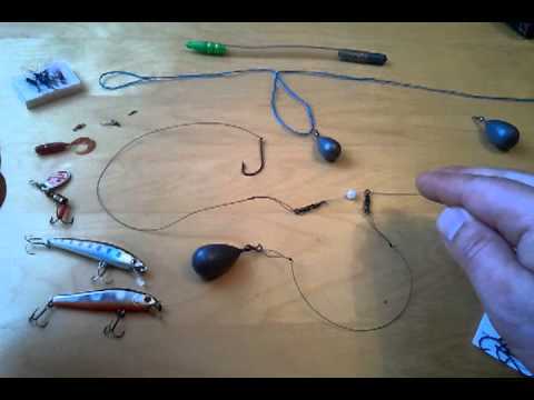 Затем на конец лески устанавливается поводок с крючком. В отверстие карабина крепится поводок с грузилом таким образом, чтобы основная леска свободно скользила между стопорами. Поводок должен быть тоньше основной лески примерно на 0,1мм..