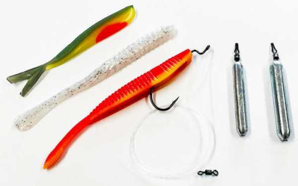 - Наибольшую эффективность оснастке придают длинные силиконовые приманки – черви, твистеры, слаги.