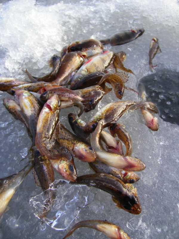 В некоторых малопроточных водоемах к весне рыба не держится около дна. Поэтому при отсутствии поклевок у дна следует проверить с мормышкой всю глубину и ловить затем в том слое воды, где будут обнаружены поклевки.