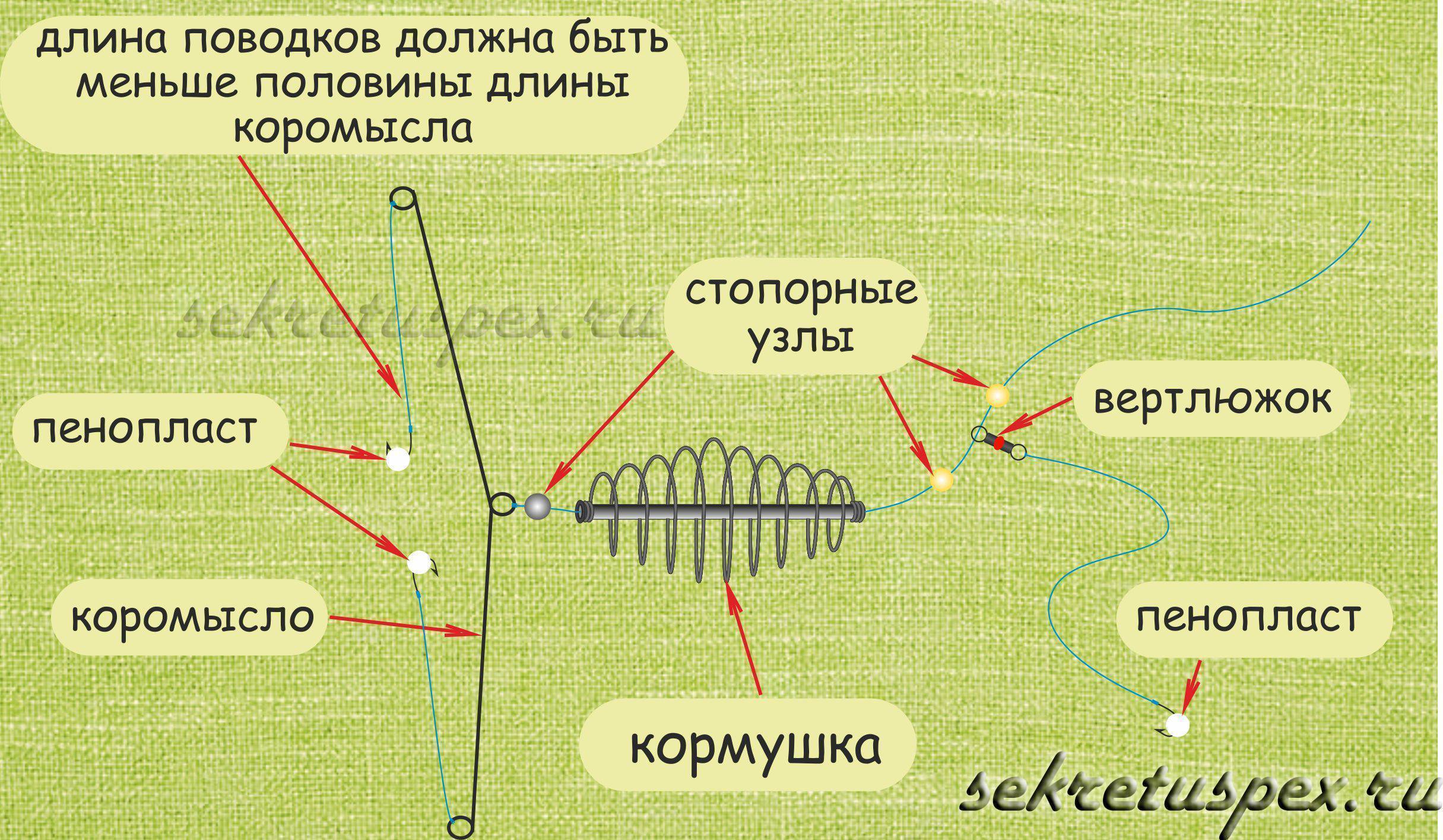 Карась обитает преимущественно в водоемах, где дно илистое, а течение весьма слабое или совсем отсутствует — пруды, водохранилища, озера. Именно для таких условий хорошо подходят монтажи патерностер и инлайн. Первый вариант предпочтительнее, так как является более чувствительным, даже когда кормушка полностью зароется в ил. Вяжется патерностер прямо на основной леске, как на рисунке ниже: