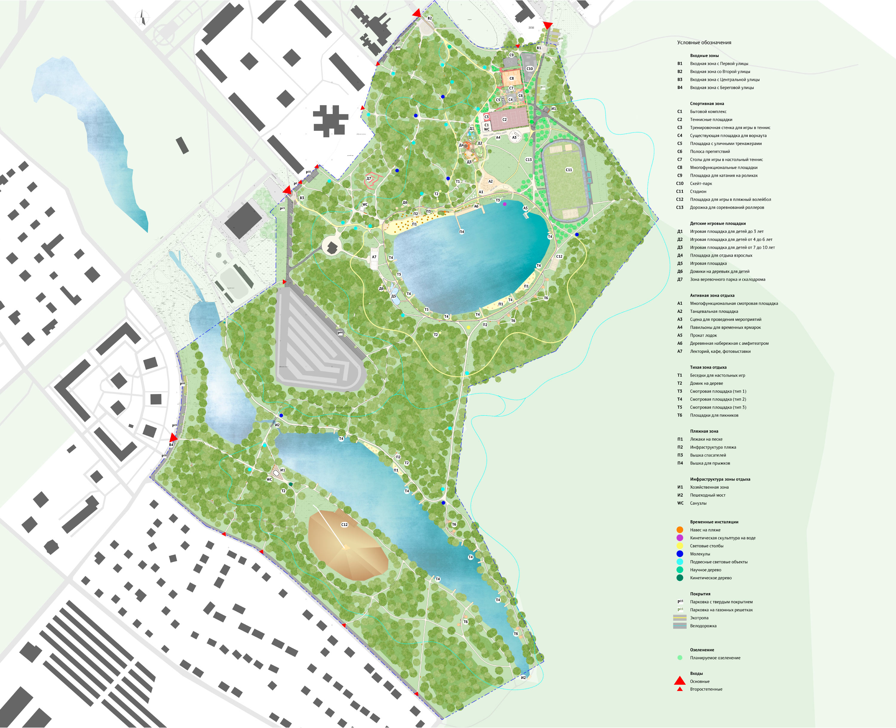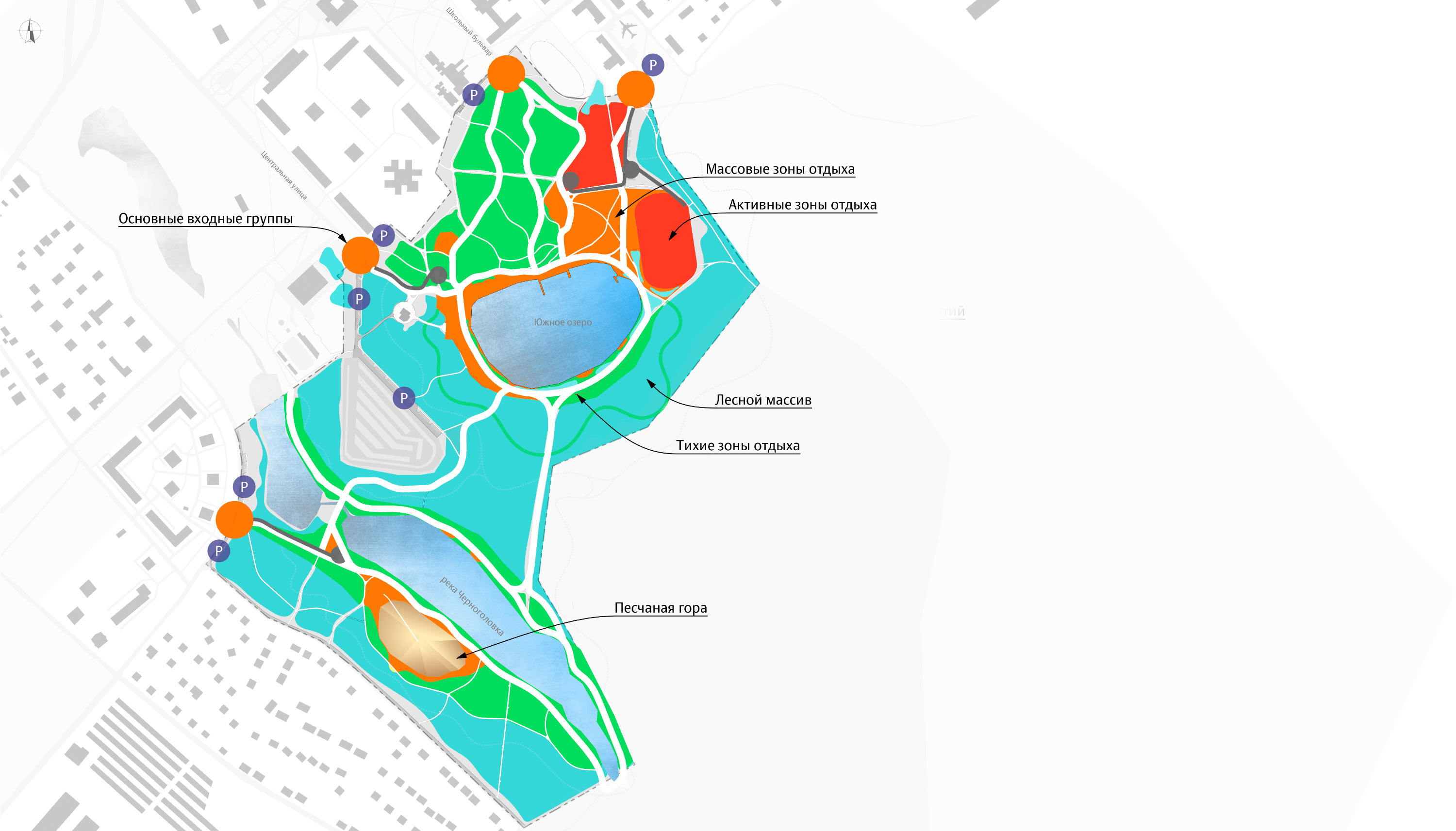 Зоны в парке различаются по степени приватности, уровню шума и активности, удобству использования и обслуживания.