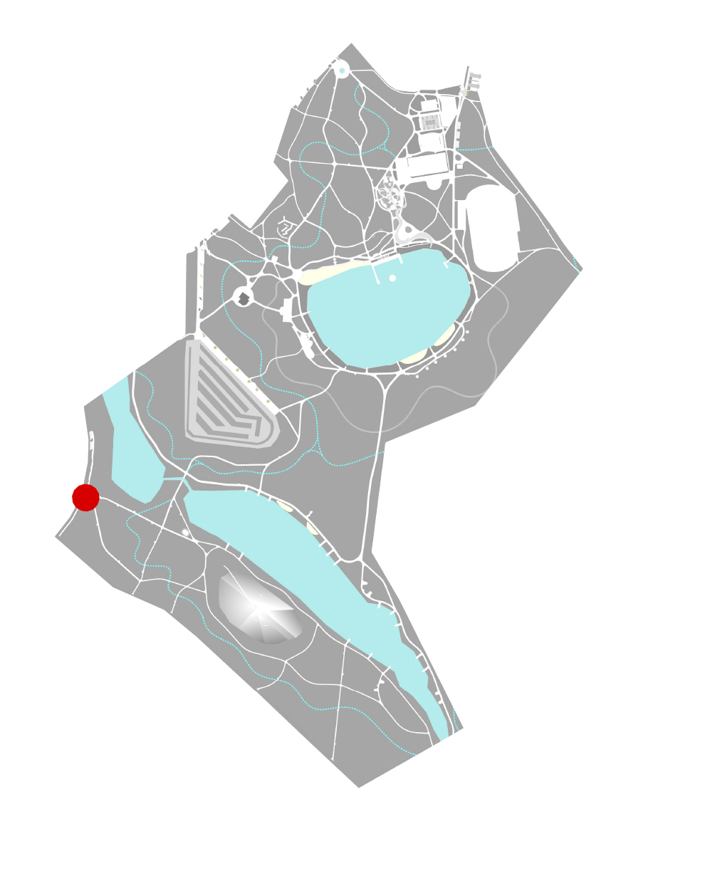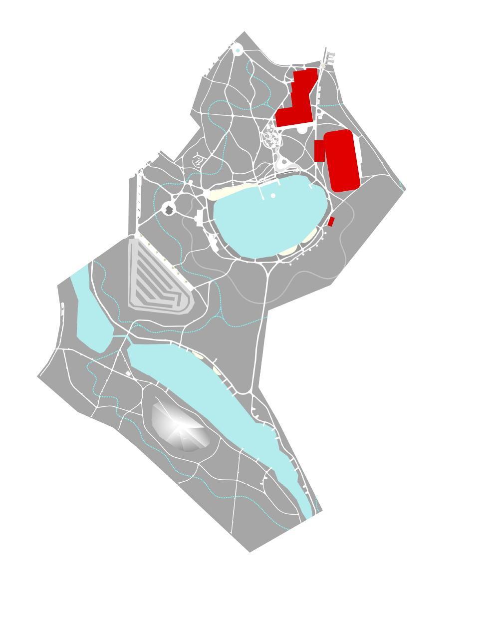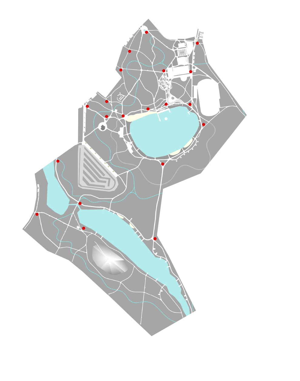 Постоянную работу парка обеспечивают четыре зоны обслуживания с техническими помещениями — пунктом охраны, площадками для сбора мусора, складами, раздевалками, подсобками, бытовыми комплексами и общественными туалетами.