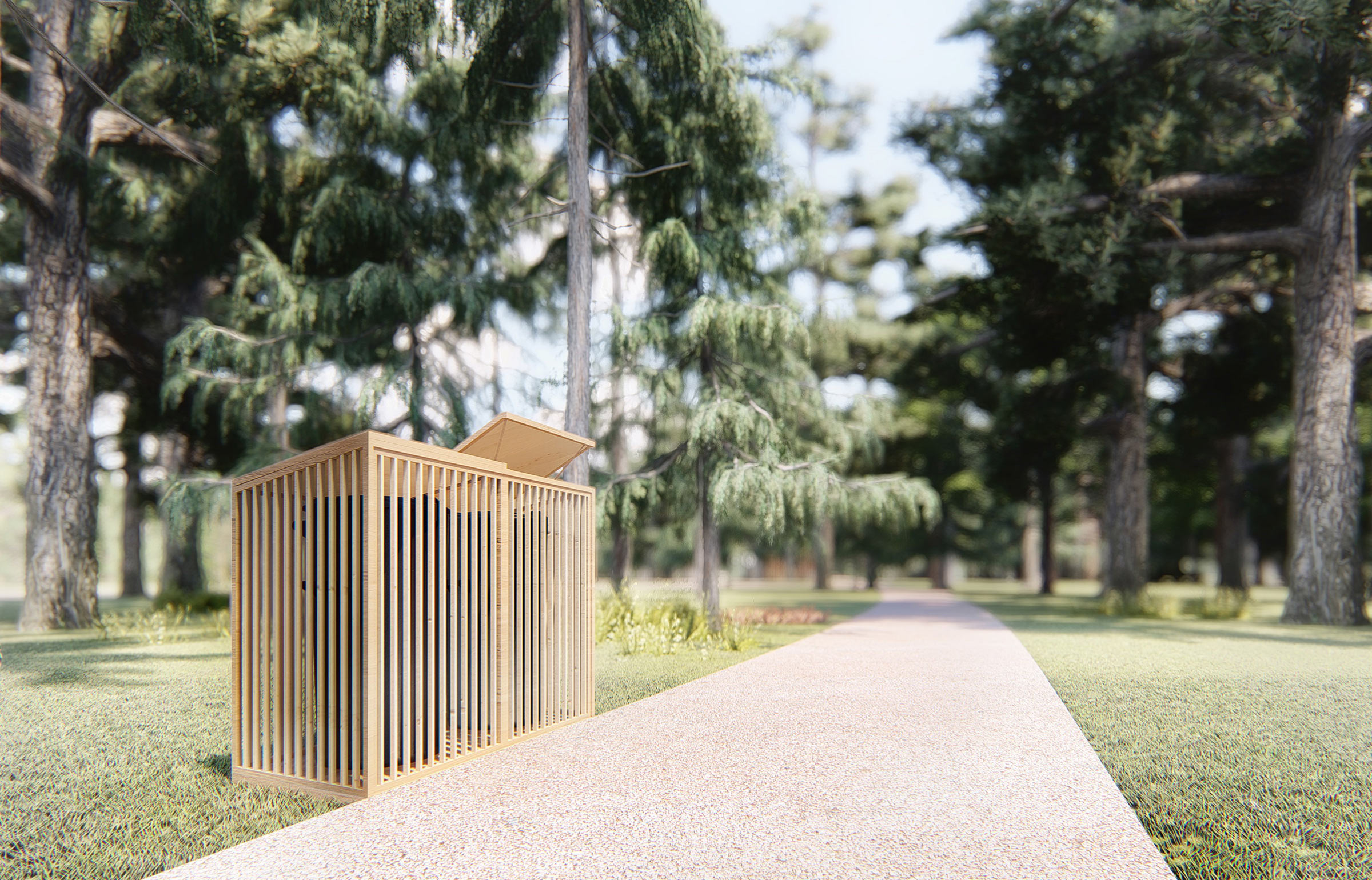 Рядом располагается выставочный стенд с вращающимися панелями разных цветов и фактур — он предназначен для выставок и экспозиций. Все элементы выполнены из дерева и гармонично вписаны в природное окружение.