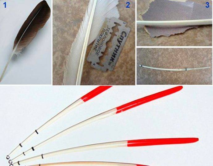 Далеко не всегда можно было приобрести поплавок из синтетического материала. Перьевые изделия давно приобрели популярность и не теряют ее до сих пор. Изготовление такого поплавка занимает буквально 10 минут. При этом деталь отличается хорошей чувствительностью и длительным сроком эксплуатации. Это хорошее решение для ловли при безветренной погоде.