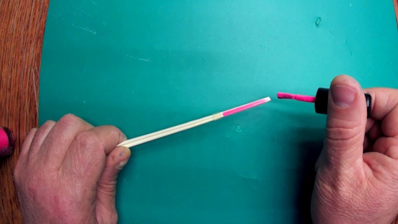 Бесцветным лаком покрыть критические точки стержня. Для надежности можно нанести состав на всю заготовку. Это позволяет предотвратить впитывание воды и продлить срок эксплуатации. Лак для ногтей можно заменить водоустойчивой краской белого цвета. Важно качественно и аккуратно обработать самую толстую часть стержня.