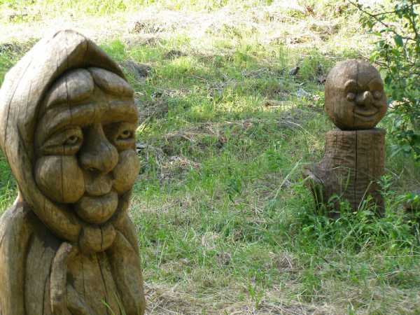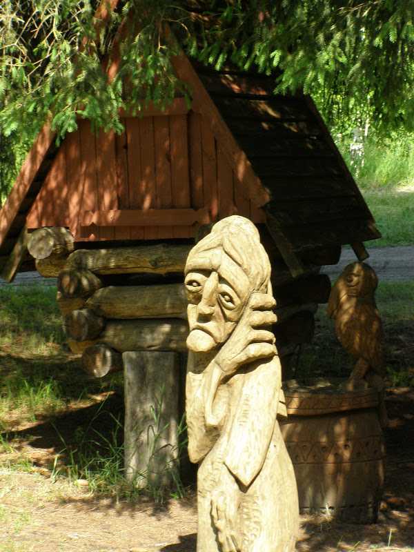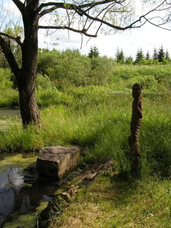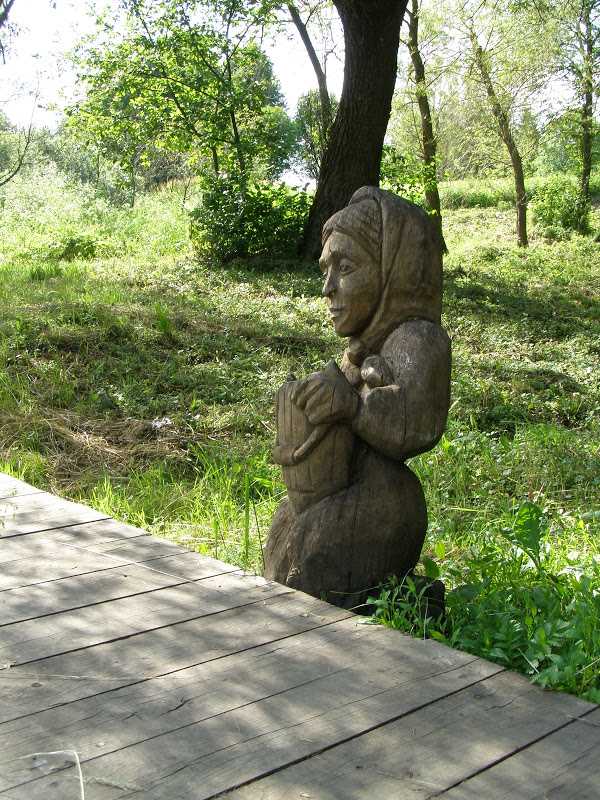 Огромную лепту в индивидуальность окружающей территории внёс местный художник Гордин В.Н., изготовивший множество деревянных фигурок в фольклорном стиле. Получилось очень замечательно и необычно, как в настоящей старинной русской сказке. Вот там как будто леший выглянет из-за деревьев, а здесь Алёнушка пришла набрать студёной водицы. С приходом весны, когда начинает цвести черёмуха и повсюду щебечут птицы, здесь чувствуется что-то родное, русское. Вот они корни Руси. Недаром, ещё тысячу лет назад чужеземцы называли Оку «Русской рекой», «рекой Рус».