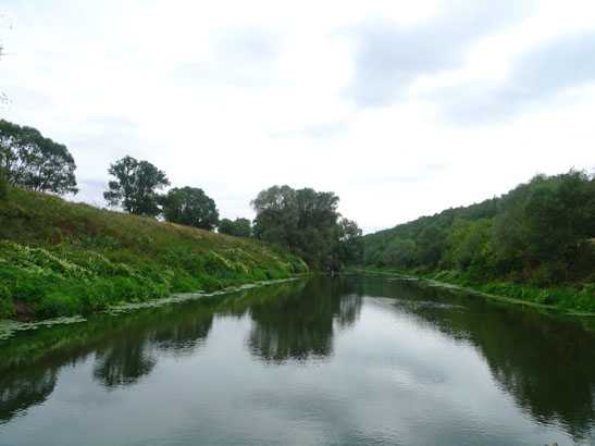 За деревней Щечьей берега реки сужается и начинает быстро нестись в крутых и высоких берегах. Ниже по течении будет разрушенная плотина.