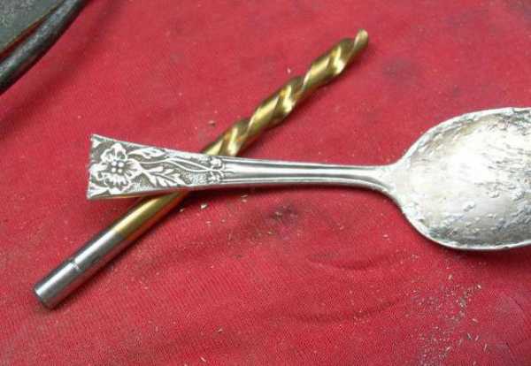 Кусачками отделяется ручка ложки, и место среза тщательно полируется напильником. Затем сверлится два отверстия диаметром 1,5 мм. Первое — у края, где находилась ручка. Второе — у противоположного конца. После сверления эти места также тщательно полируются надфилем.
