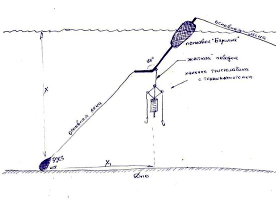 Вся оснастка фиксируется на дне с помощью грузила, размещенного на конце лески.