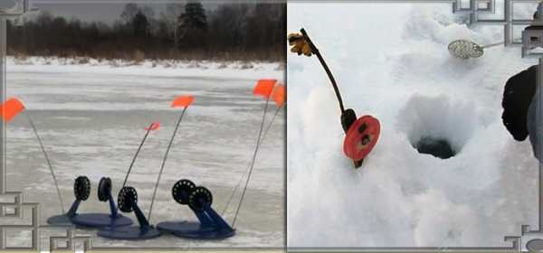 Такие удилища оснащаются относительно толстой леской и крючком, не менее 5-го номера. Насадкой служат червь, нарезка или мотыль. В отличие от блеснения поплавочных снастей можно установить несколько и периодически их проверять. Пропущенная поклевка обернется запутыванием снасти, но рыба, как правило, не сходит.