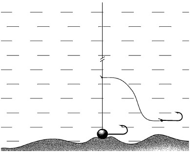 Найдя подходящую «точку», надо постараться заякорить лодку примерно на том расстоянии от нее, на которое вы будете забрасывать снасть. То, что вы встали правильно, можно выяснить во время небольшого подтягивания на себя поплавка — он ляжет, то есть грузило вылезет на бугор (рис. 1).