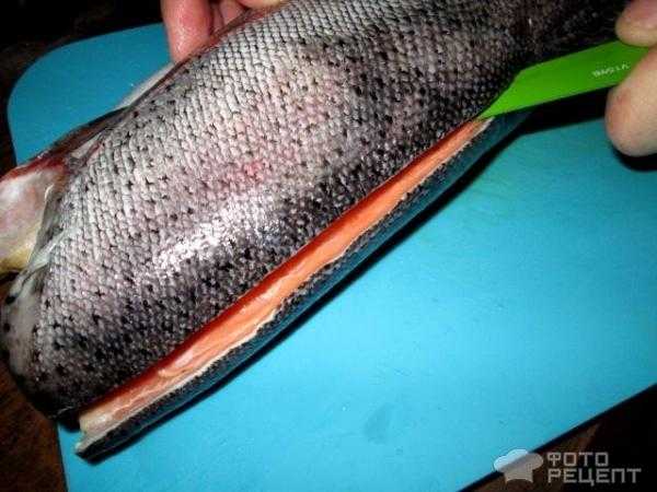 Гораздо важнее хорошенько очистить мясо от крови и слизи, прежде чем засолить форель в домашних условиях. Рецепт подробно описывает всю процедуру – после того, как промыли рыбу и удалили внутренности.