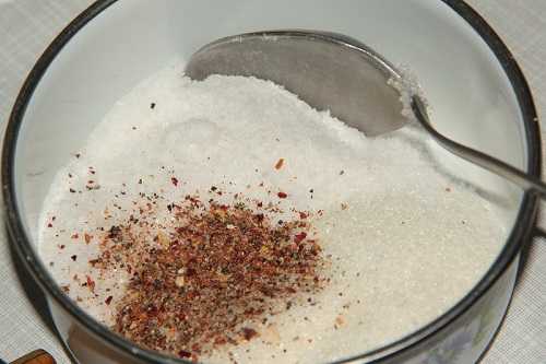 Засаливание начинается с подготовки ингредиентов. В небольшую емкость из любого материала насыпаем соль крупного или первого помола из расчета 2 столовые ложки на килограмм рыбной туши. В эту же посуду добавляем сахарный песок. Соотношение соли и сахара должно быть на уровне 2:1 (2 части соли и одна часть сахара).