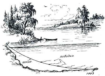 Состоит из одного стационарно закреплённого или скользящего грузила на конце лески и нескольких отводных крючков.