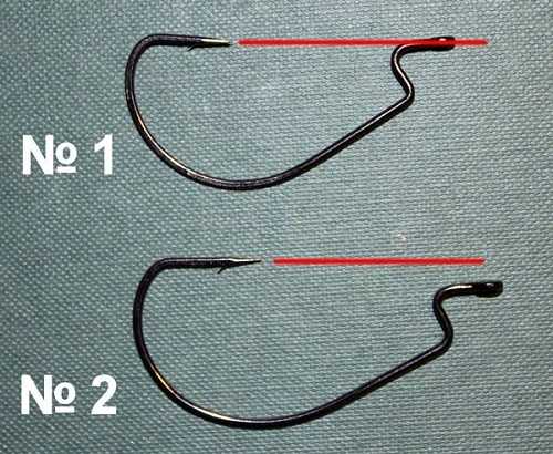 У крючка №1 жало смотрит четко на цевье . А у крючка №2 – чуть выше.