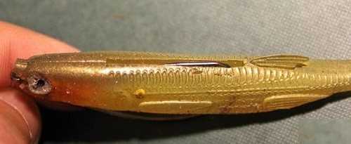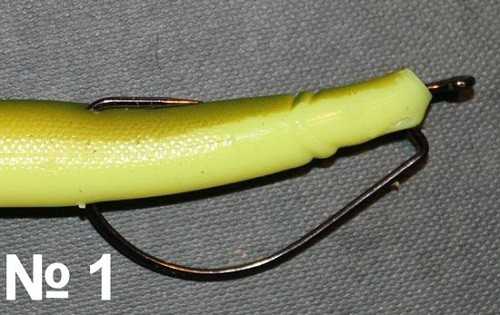 Ну если Вам хочется, чтобы жало было спрятано в теле приманки, то можете прорезать в теле резины небольшую канавку под крючок.