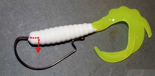 Сперва колющая часть крючка пронизывается через «ротик» приманки, выходит через «шейку». Остается только развернуть крючок (провернуть), после чего – зацепить им брюшко силикона.