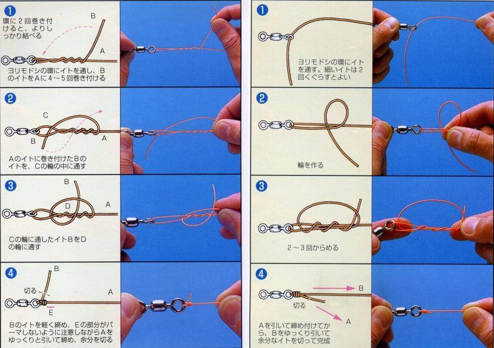 К данной группе относятся узлы, плотно охватывающие колечко и на нем же затягивающиеся. Они компактны, просты, пригодны при любых оснастках, но особенно хороши на тонких лесках. Их много, поэтому рассмотрим лишь два наиболее распространенных и несложных в исполнении.