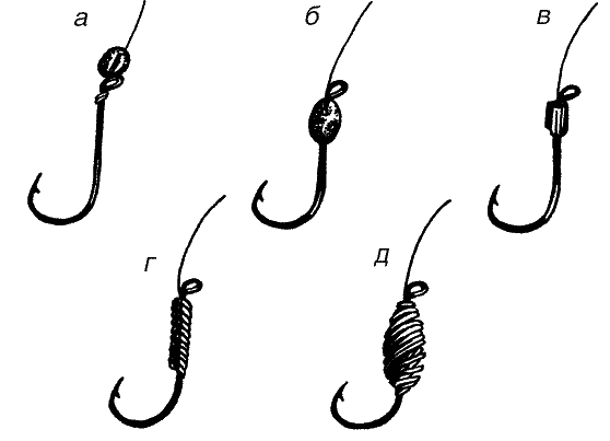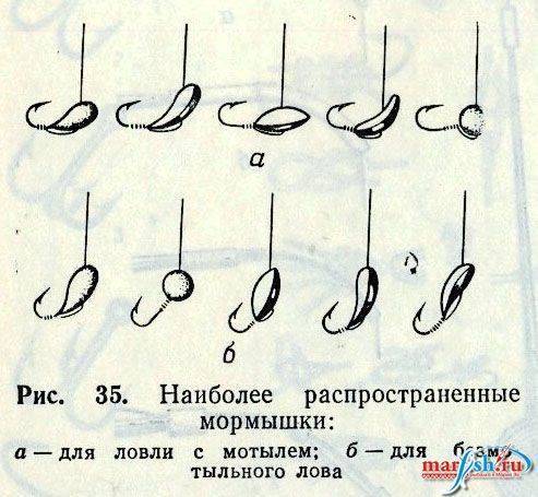 «Перворожденные» мормышки были всего лишь свинцовыми дробинками с прорезями по телу и попросту обвязывались тонкой бечевкой. Первые приманки с отверстием в теле стали качественным шагом вперед и потребовали несколько иного подхода к привязыванию. Делались они преимущественно из свинца и олова, то есть, мягких металлов, поэтому проблема перетирания лески столь остро не стояла.