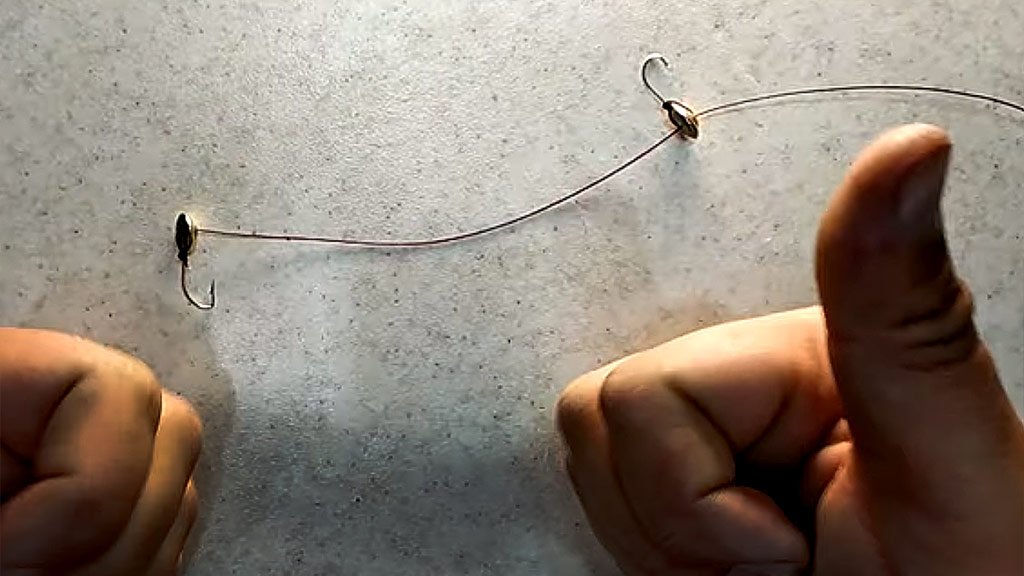 Иногда рыболовы прикрепляют двойную оснастку к удилищу только одним крючком, оставляя второй незакрепленным.