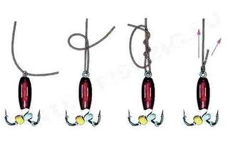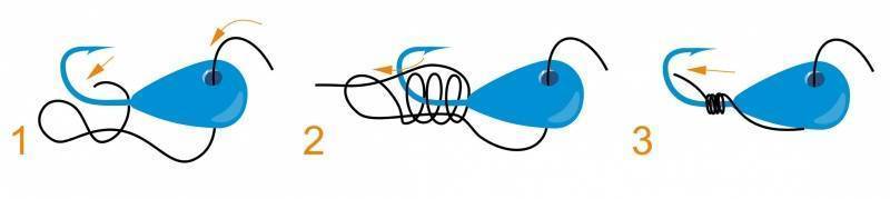 Вяжется такой узел по аналогии с простым поводковым или «веретеном». Однако после продергивания в отверстие или ушко (актуально для всех мормышек) леска только перебрасывается через цевье, а затем обвивается и затягивается вокруг самой себя, не захватывая крючок.